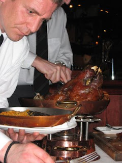 Here are the pig's heads, that followed the quail. Notice how the staff expertly carve them, no half a head plunked on a plate. I love silver service, please note this restaurant has stools for your handbag, it reminds of France. We were given a choice of pieces; I of course, had everything. Two types of lentils, yellow and black, were served along with the head and there was cabbage as well. This was no place for a vegetarian but we did eat our veggies.